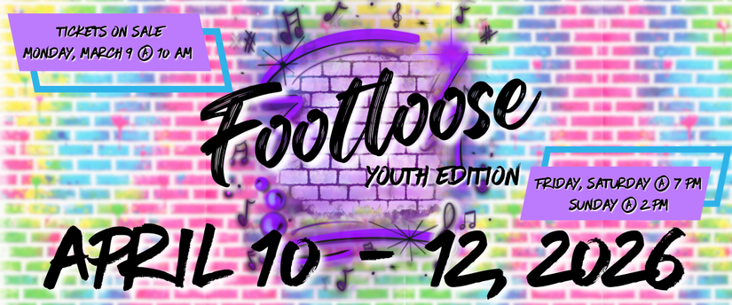 When city teen Ren McCormack moves to a small town where dancing is banned, he rallies his new friends to fight for joy, freedom, and the right to boogie. With powerhouse hits like “Holding Out for a Hero,” “Let’s Hear It for the Boy,” and of course “Footloose,” audiences will be on their feet from start to finish. Full of electrifying dance numbers, unforgettable music, and a story about standing up for what you believe in, Footloose: Youth Edition is a perfect blend of nostalgia and fresh, youthful energy. Join us as our talented middle school cast proves that sometimes you just can’t stop the beat!